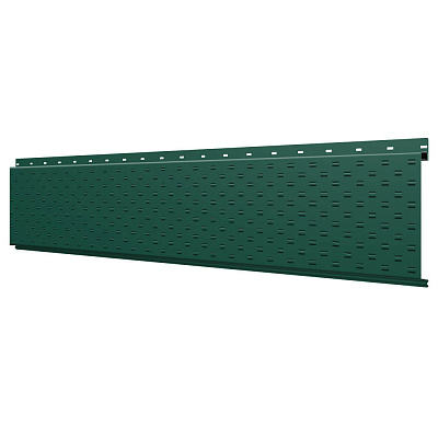 Линеарная потолочно-стеновая панель с ПЕРФОРАЦИЕЙ для вентиляции цвет RAL6005 Зеленый Мох применяется в качестве софитов для подшивы крыши, наружной и внутренней отделки потолков, стен, фронтонов фасада дома в Великом Новгороде.