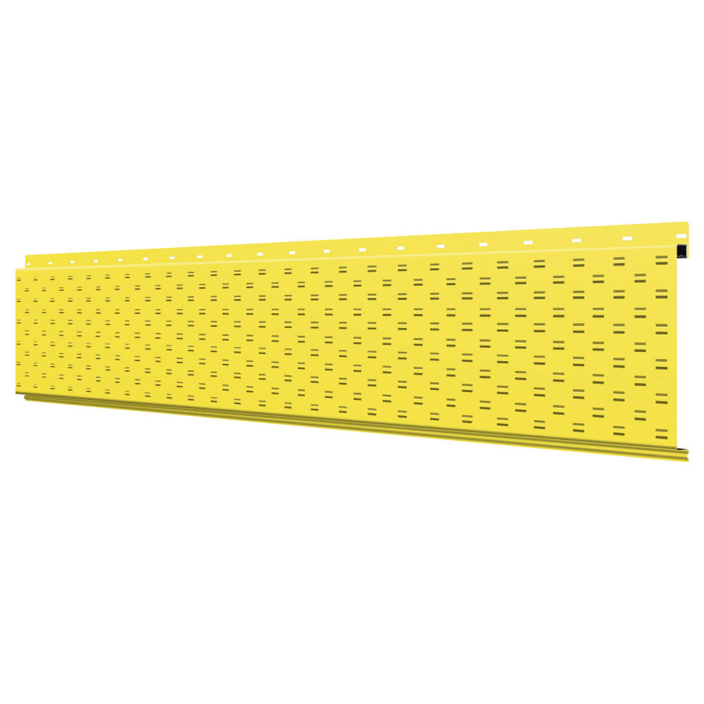 Линеарная потолочно-стеновая панель с ПЕРФОРАЦИЕЙ для вентиляции цвет RAL1018 Желтый применяется в качестве софитов для подшивы крыши, наружной и внутренней отделки потолков, стен, фронтонов фасада дома в Великом Новгороде.