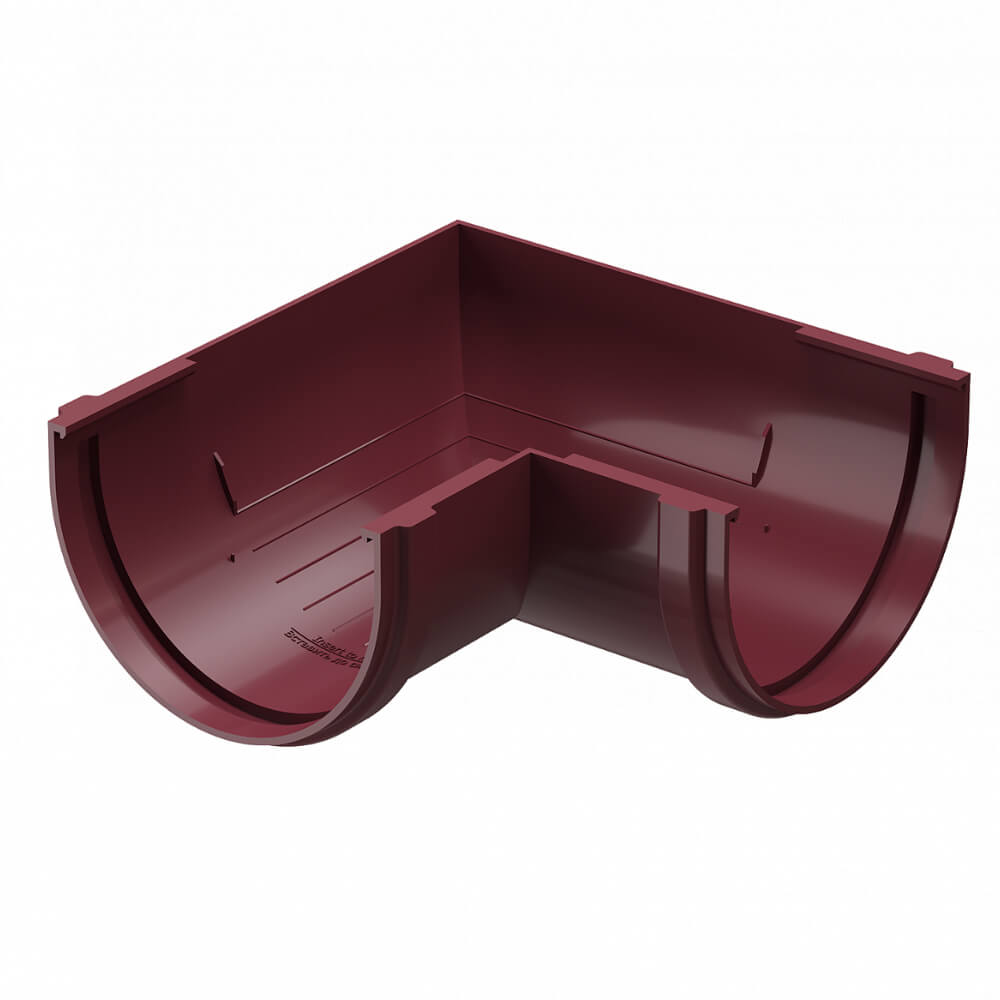 Угловой элемент желоба универсальный ДЕКЕ STANDARD d120мм 90 градусов цвет RAL 3005 Красный в Великом Новгороде. Угловые элементы устанавливаются как на внешних, так и на внутренних углах кровли и предназначены для соединения желобов.